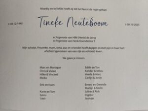 Op 8 oktober is ons oud-lid Tineke Neuteboom overleden. Ze is gedurende lange tijd lid geweest van HBC. Onze gedachten gaan uit naar haar familie.